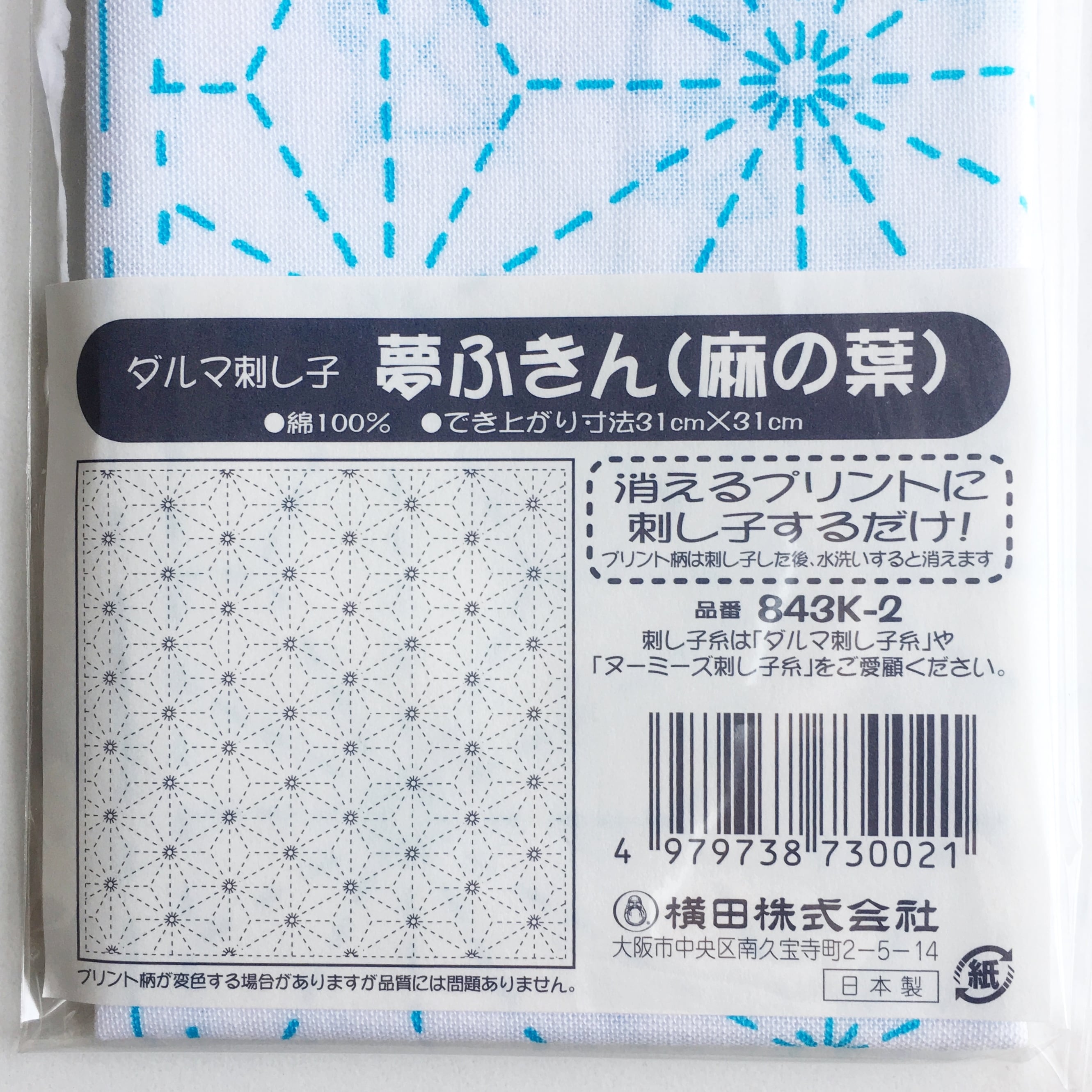 刺し子用のふきん。あらかじめプリントされている柄に沿って縫うだけで、簡単に刺し子ふきんが作れます。完成後、水洗いするとプリント柄は消えます。