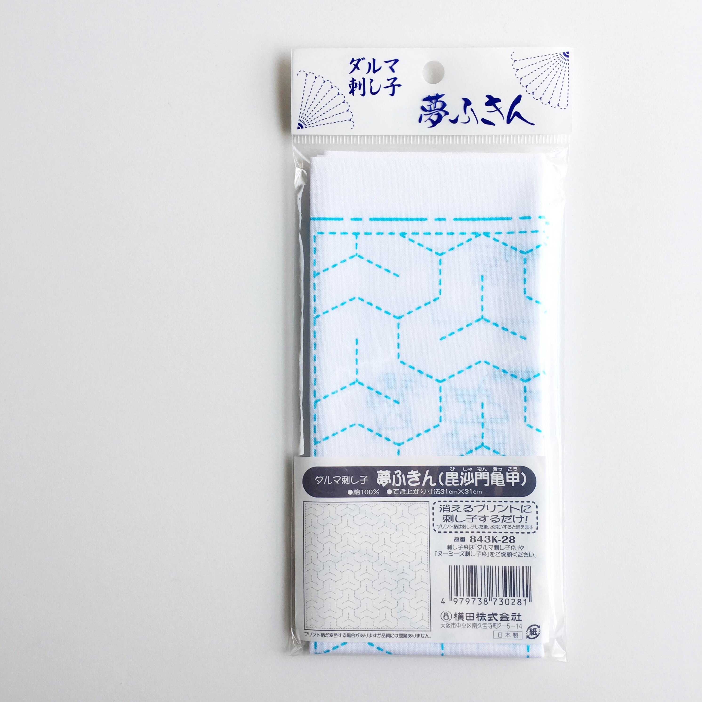 刺し子用のふきん。あらかじめプリントされている柄に沿って縫うだけで、簡単に刺し子ふきんが作れます。完成後、水洗いするとプリント柄は消えます。
