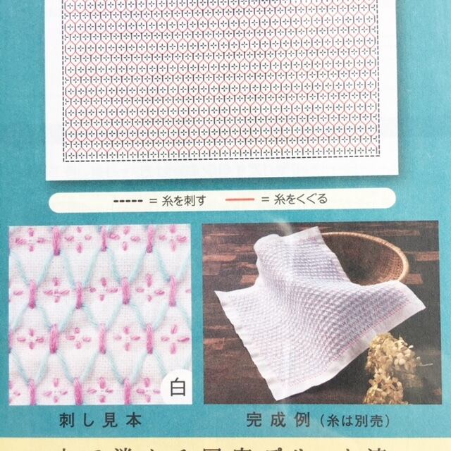 くぐり刺しは刺す部分のみプリントされており、はじめにプリントにそって刺し子をしていただきましたあと、布と糸の間をくぐらせて模様を完成させる技法です。