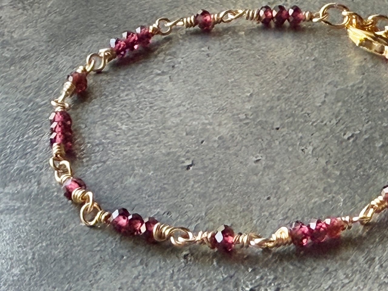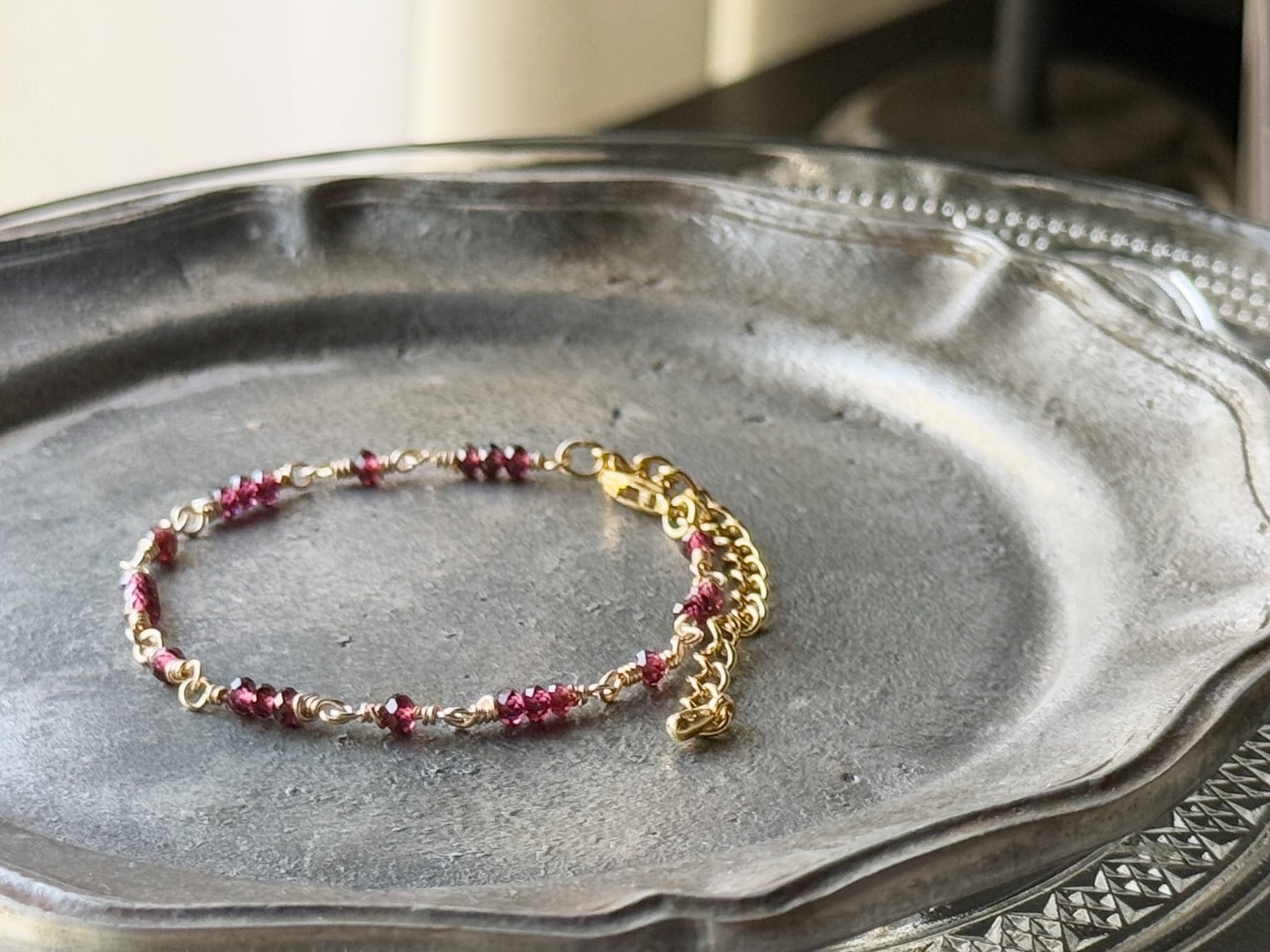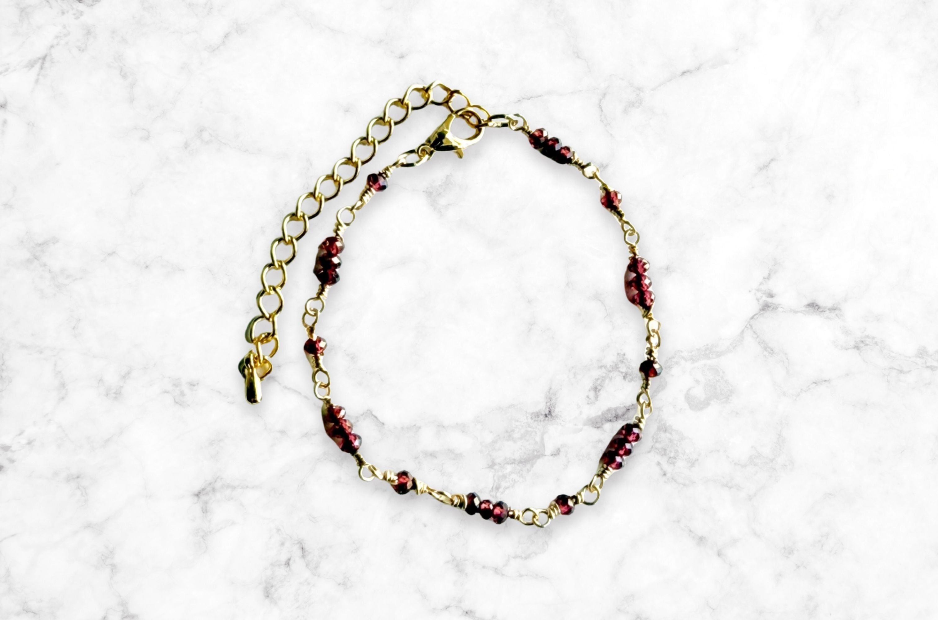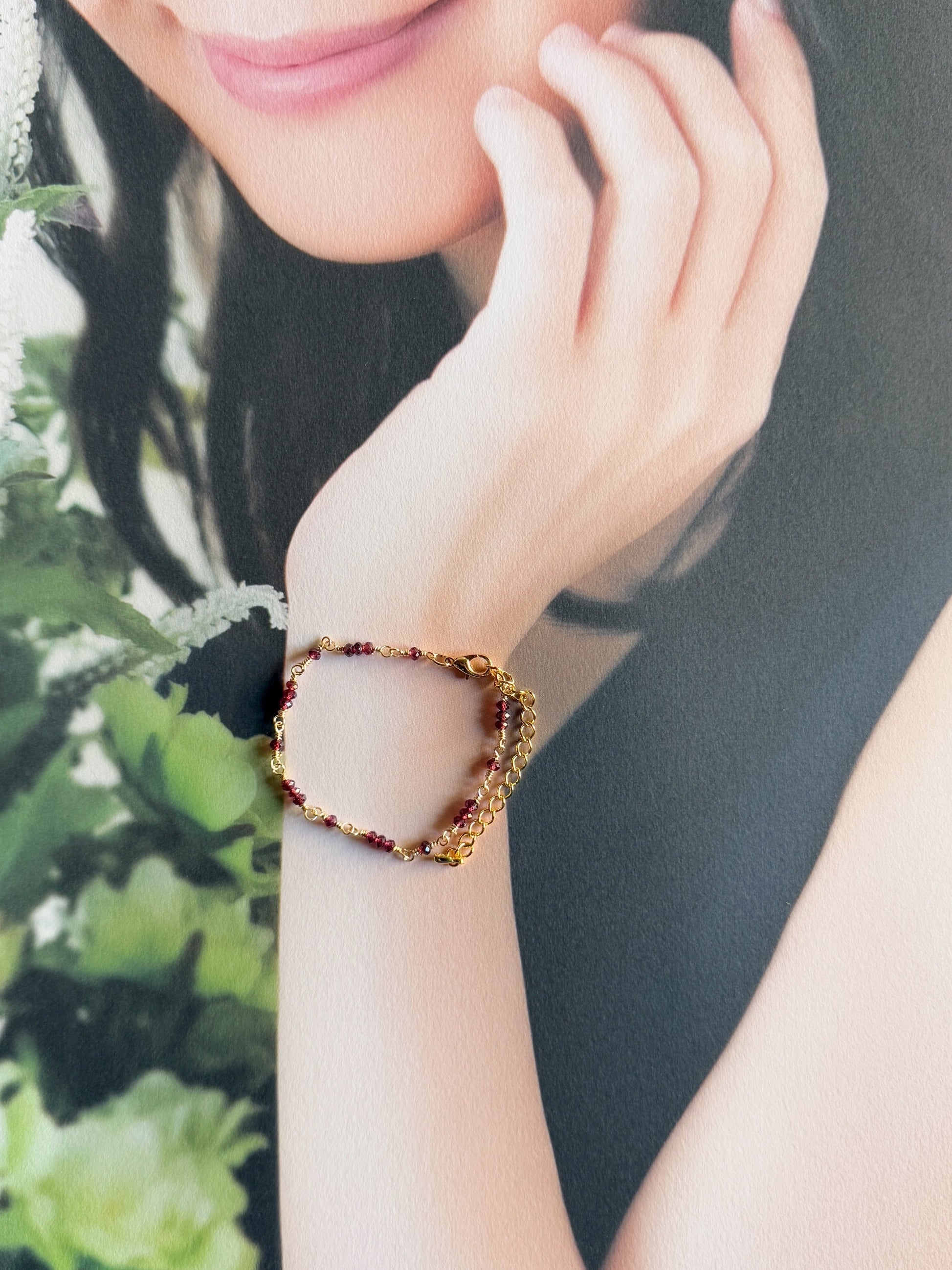 1月の誕生石・ガーネットを主役にした、華奢なブレスレットです。