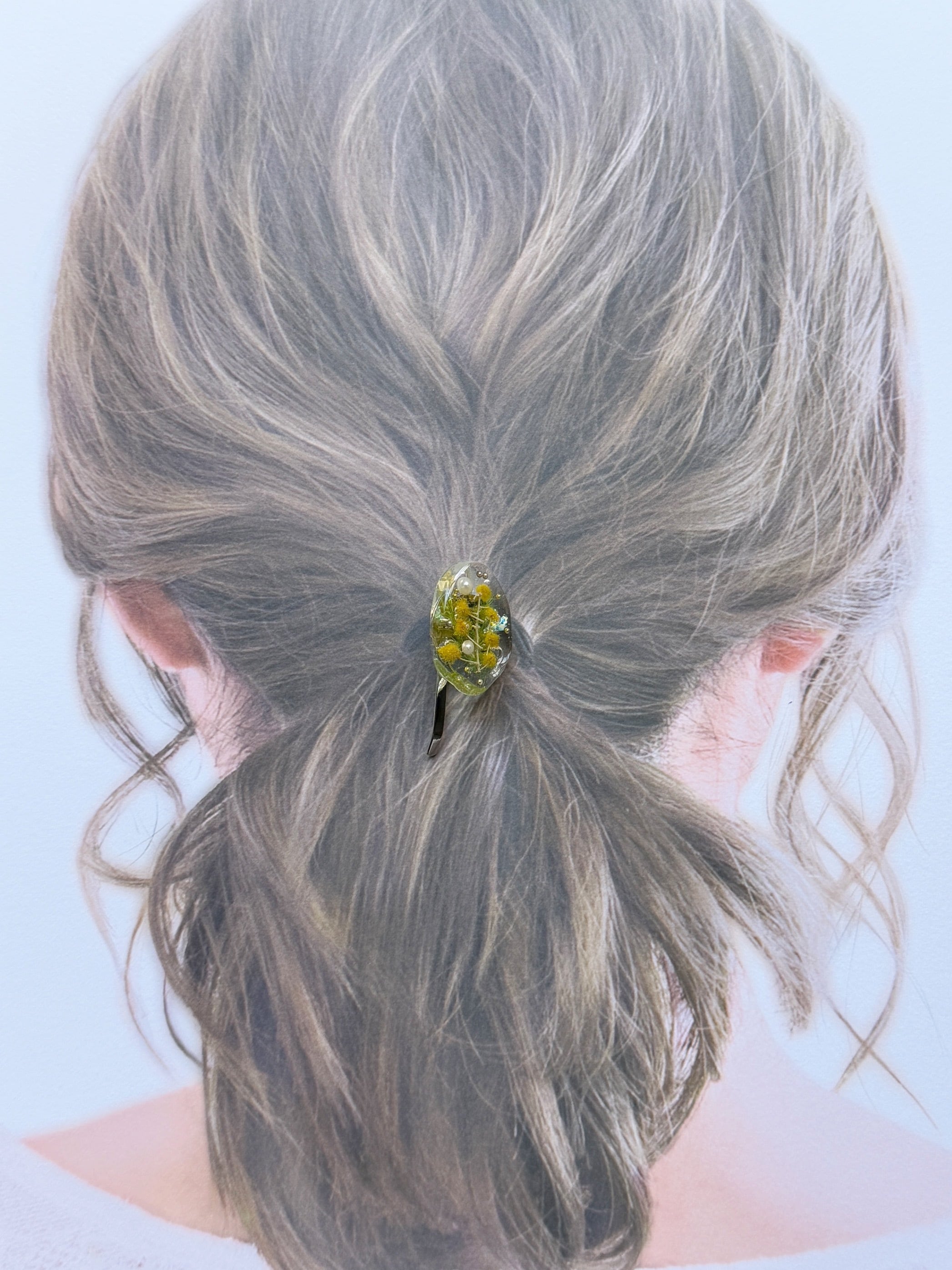 透明感のあるレジン(樹脂)に閉じ込めて、ポニーフックに仕立てました。