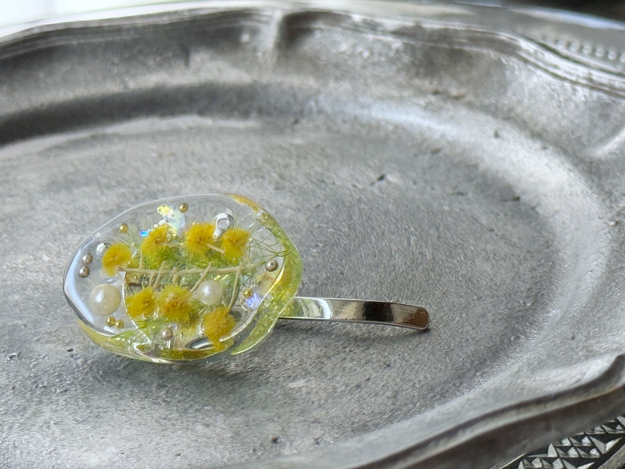 感謝の花、ミモザをそっと身につけて。長く使えるミモザのレジン・アゲートポニーフック