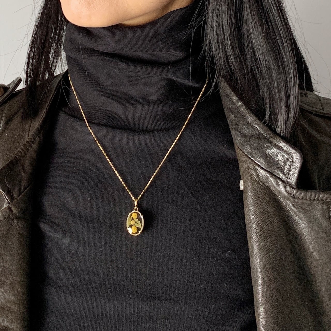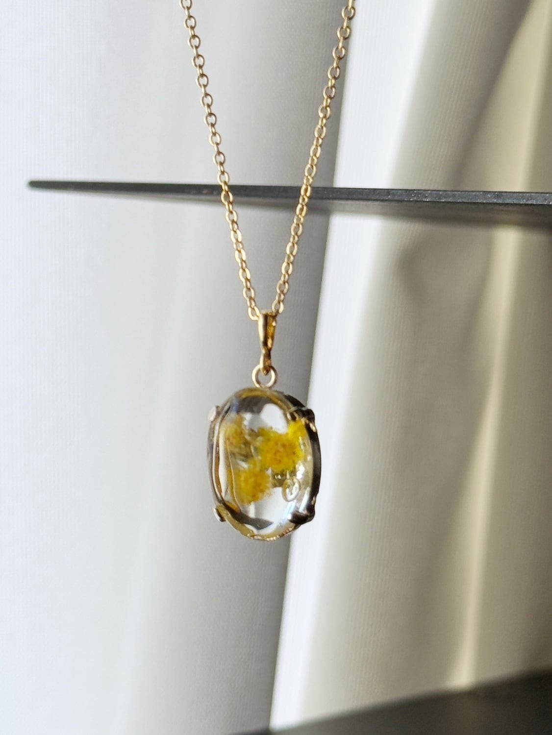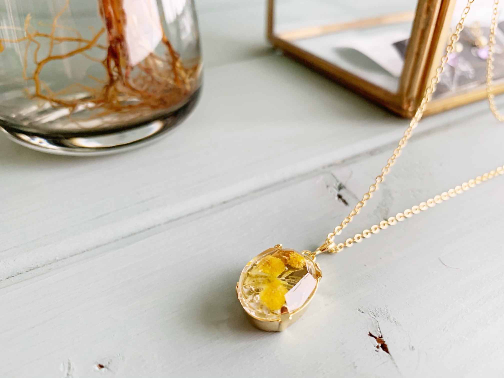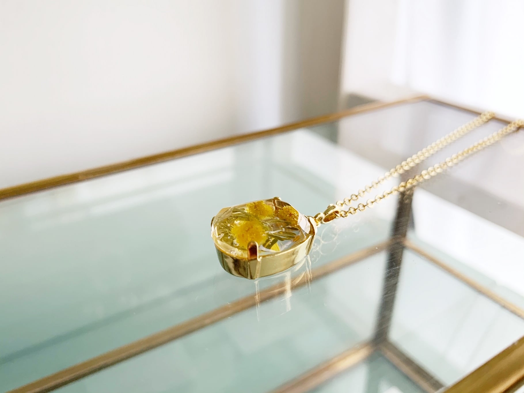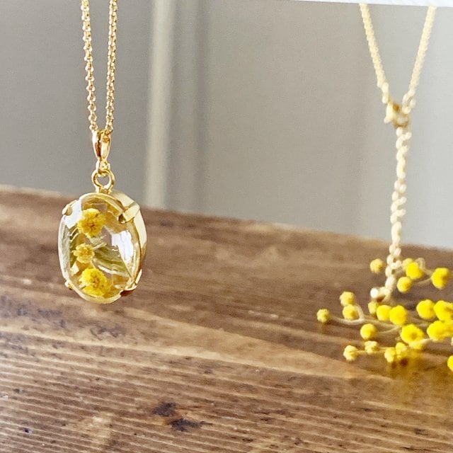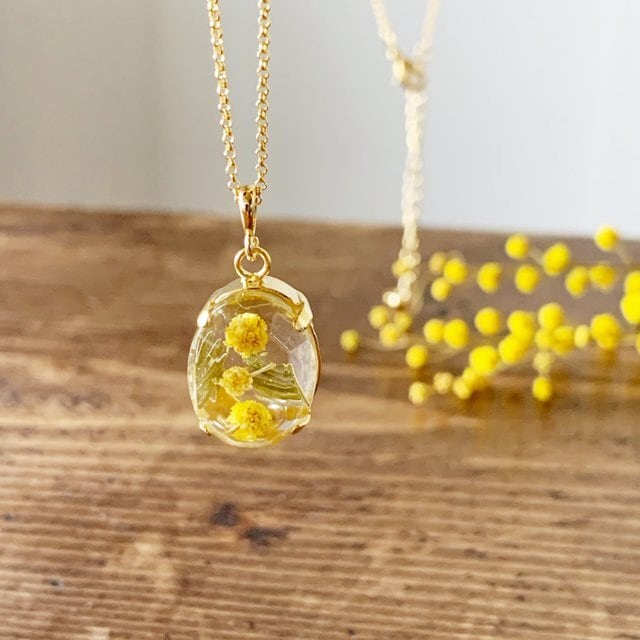 感謝の花ミモザを胸元に。装いに溶け込む透明感 ミモザのレジン・オーバル・ネックレス