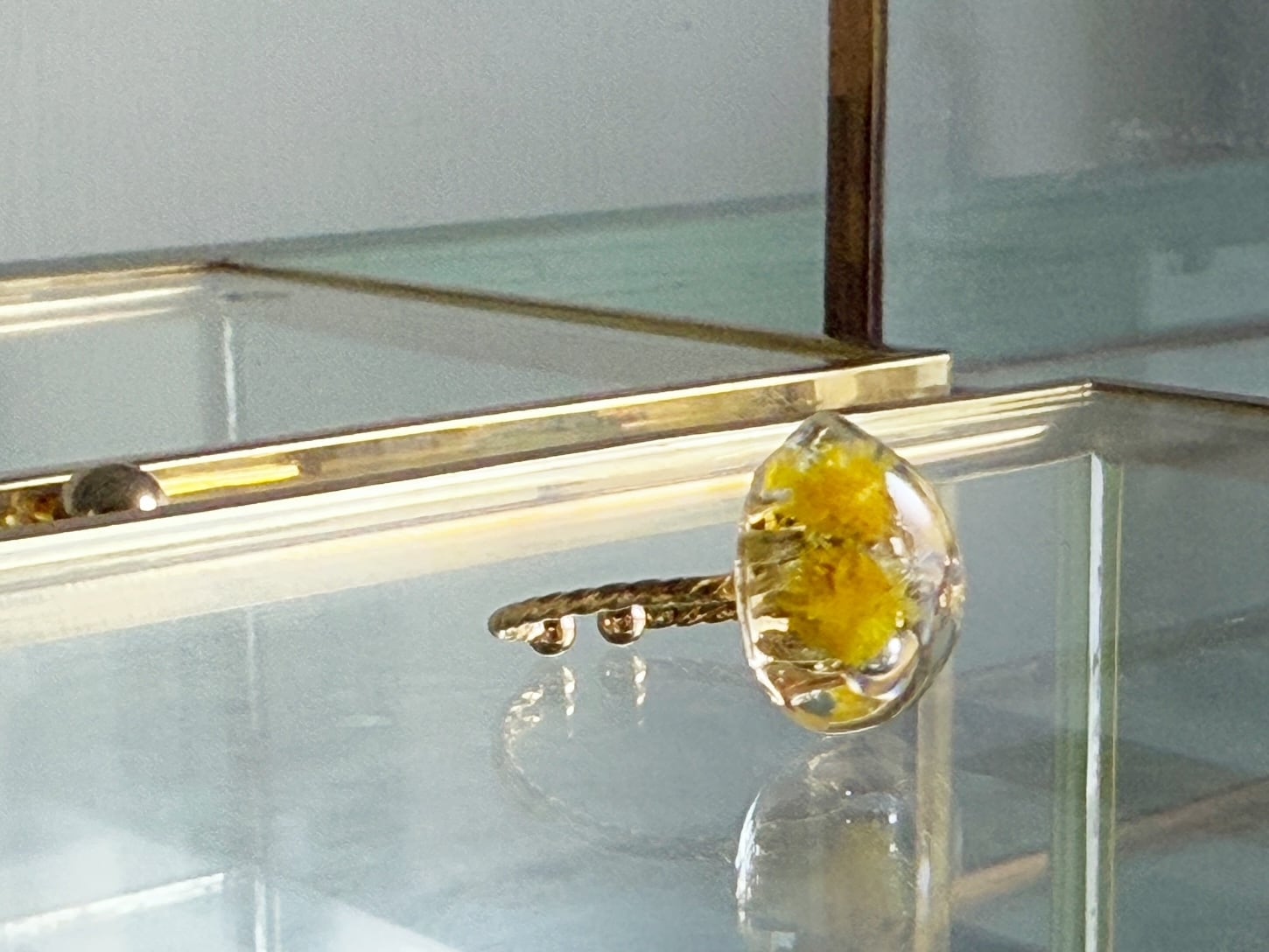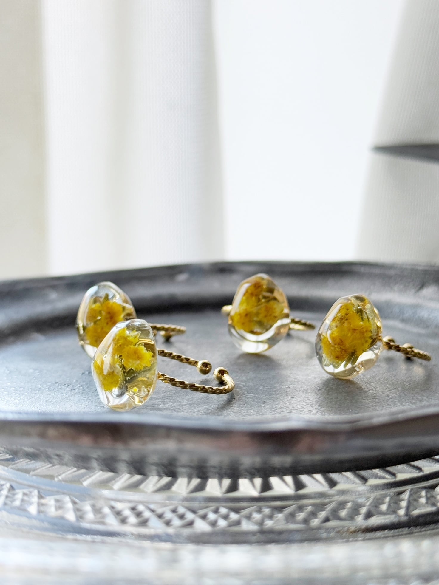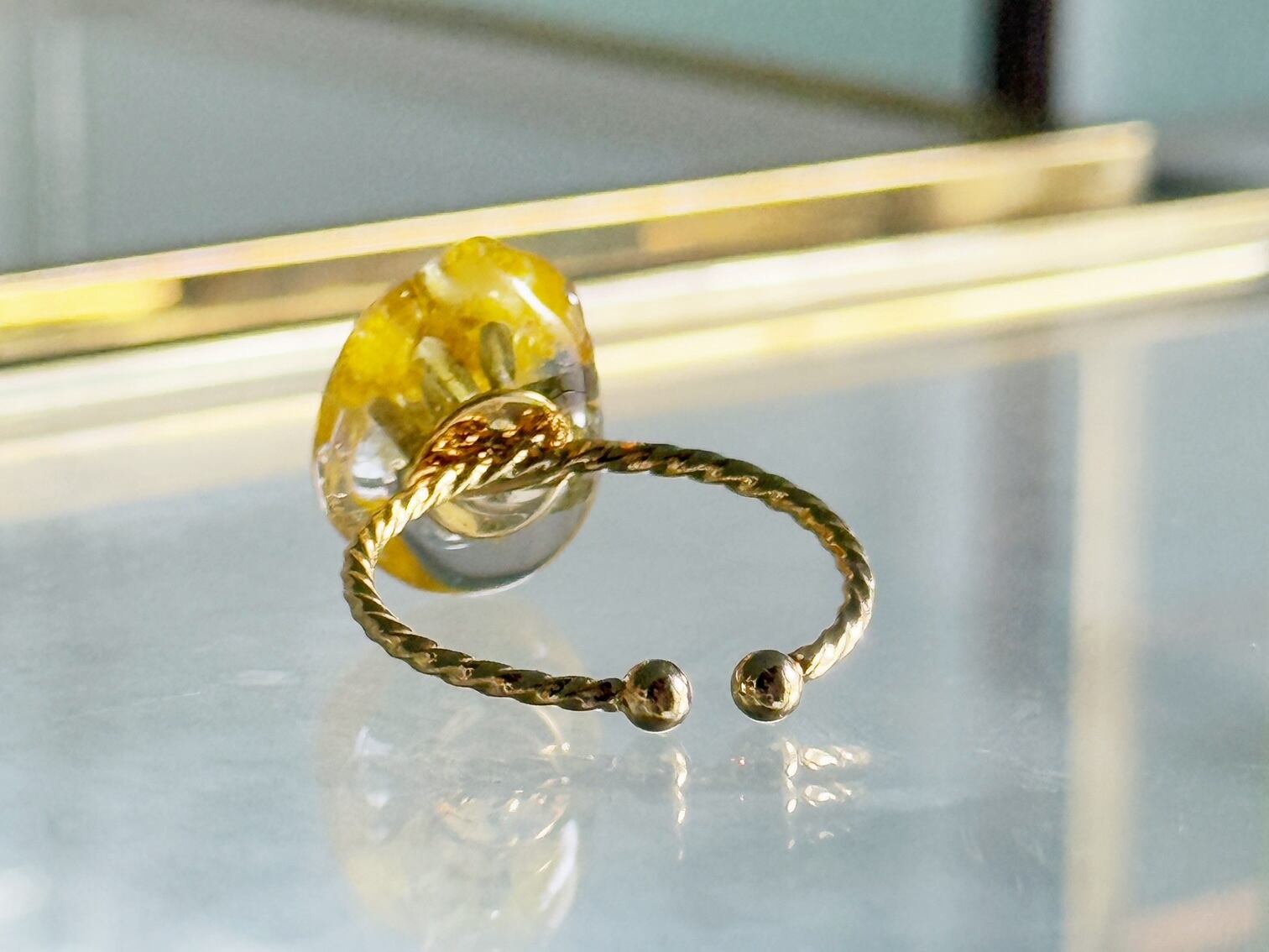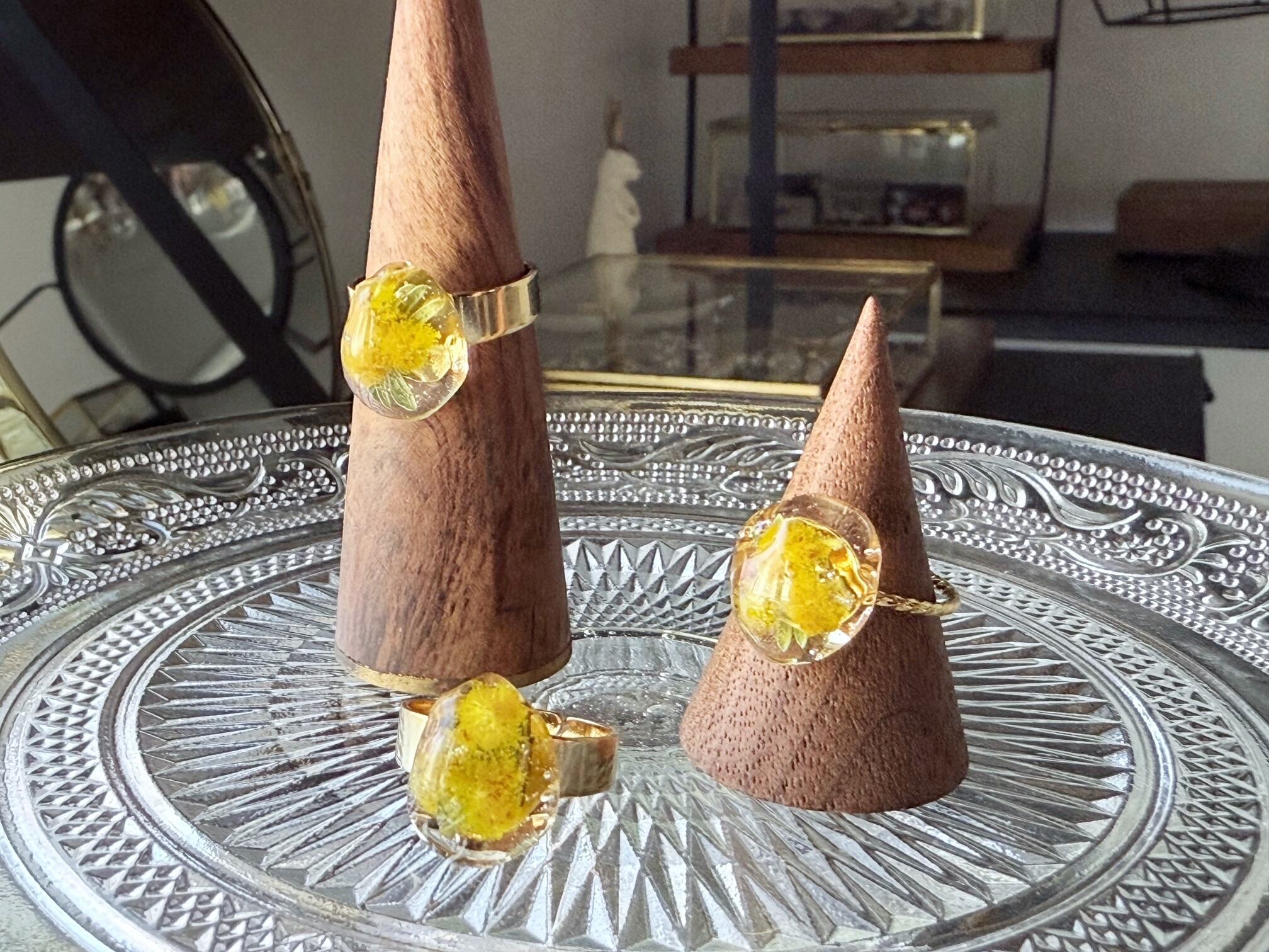 そのやさしい黄色を、透明なレジンの中にそっと閉じ込め、指輪に仕立てました。