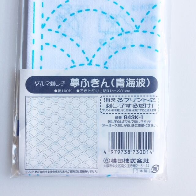 刺し子用のふきん。あらかじめプリントされている柄に沿って縫うだけで、簡単に刺し子ふきんが作れます。完成後、水洗いするとプリント柄は消えます。