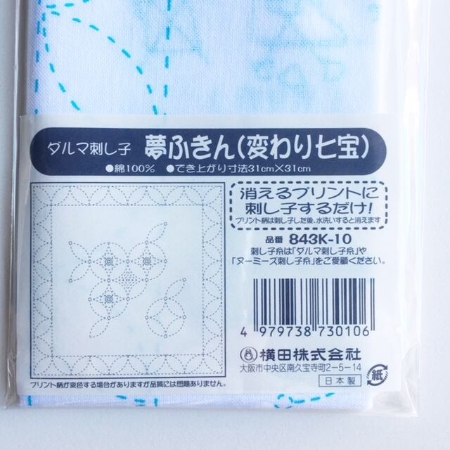 刺し子用のふきん。あらかじめプリントされている柄に沿って縫うだけで、簡単に刺し子ふきんが作れます。完成後、水洗いするとプリント柄は消えます。