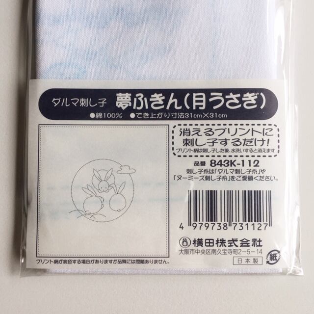 刺し子用のふきん。あらかじめプリントされている柄に沿って縫うだけで、簡単に刺し子ふきんが作れます。完成後、水洗いするとプリント柄は消えます。