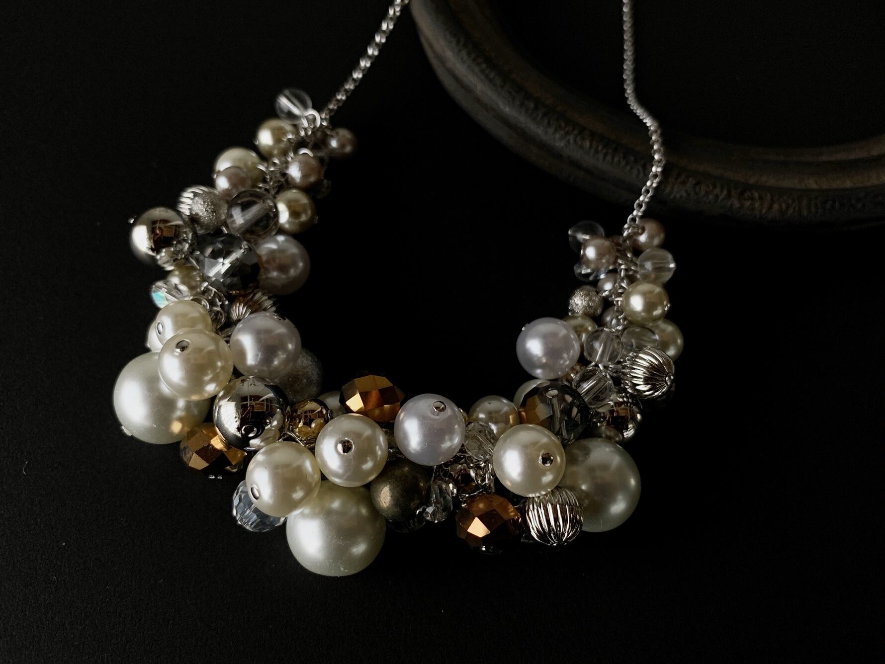 商品だけをみると派手に一見感じますが、身につけてみると馴染みやすく、胸元をさらりと華やかにしてくれる一品です。