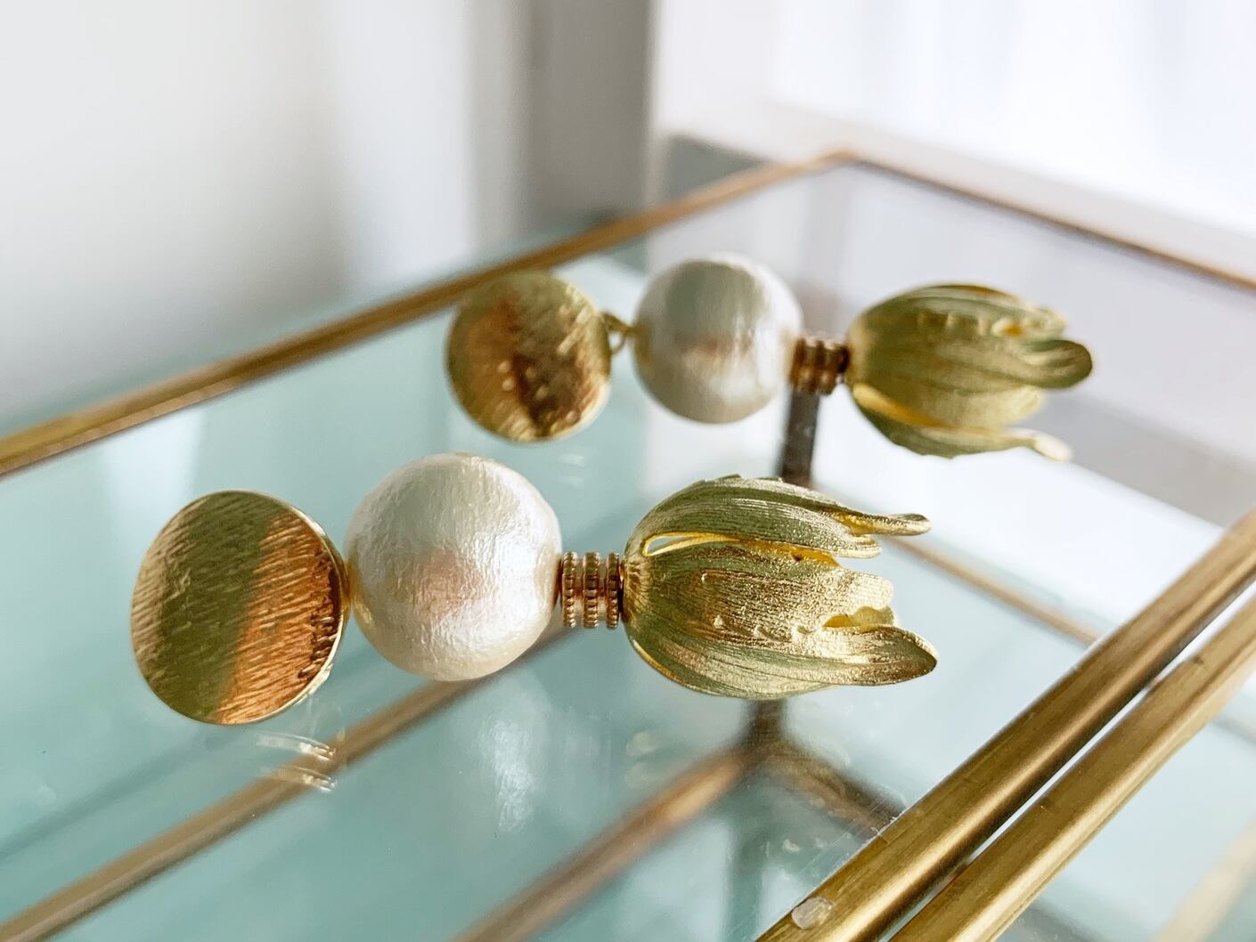 ゴールド(色)のメタリック一粒ピアスに、コットンパールとフワラーモチーフを添え、様々なシーンで活躍してくれるピアスに仕立てました。