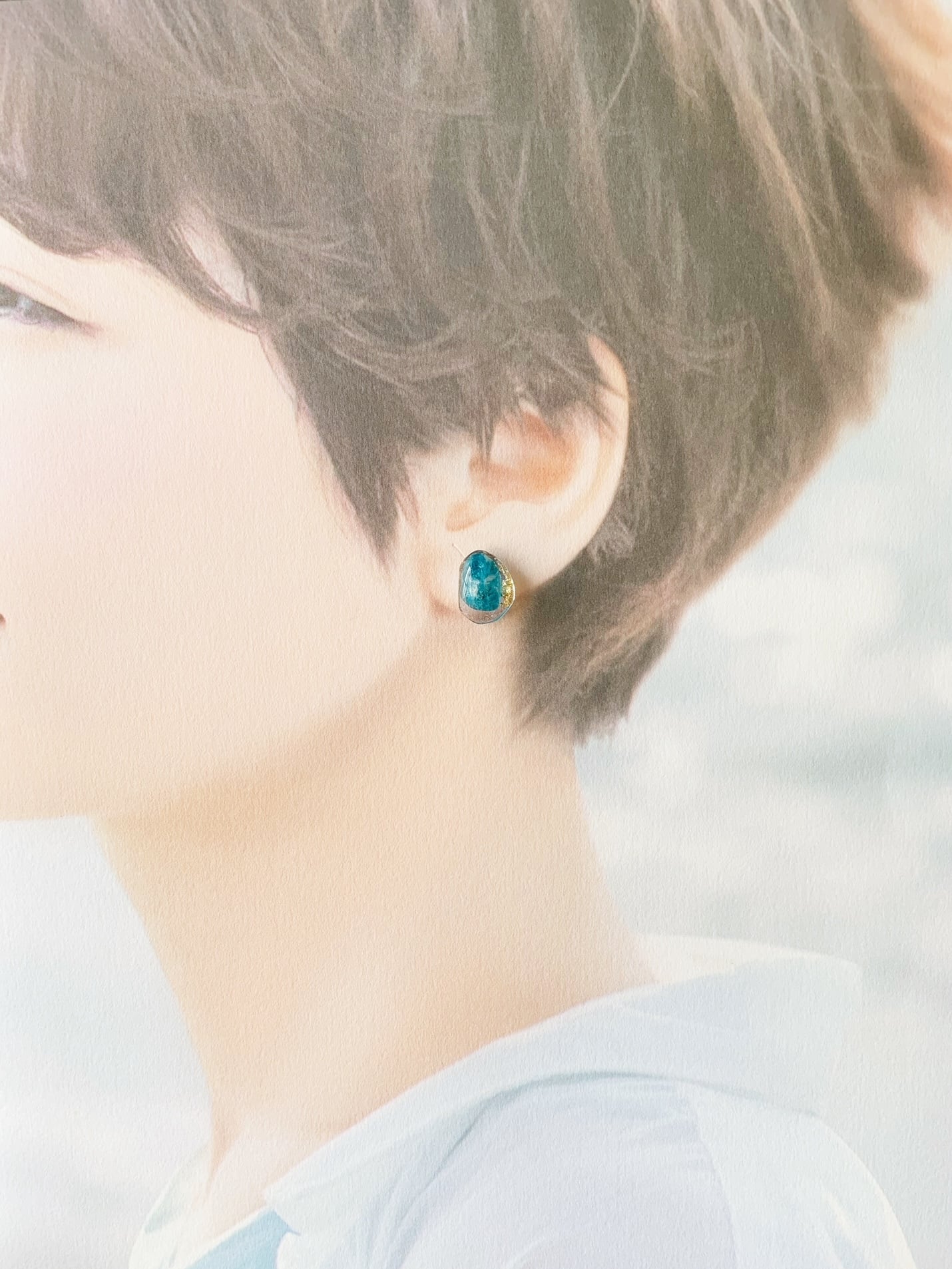 ブルーアパタイトのさざれ石(細石)をレジン(樹脂)に閉じ込め、小ぶりのスタッツイヤリング/ピアスに仕立てました。
