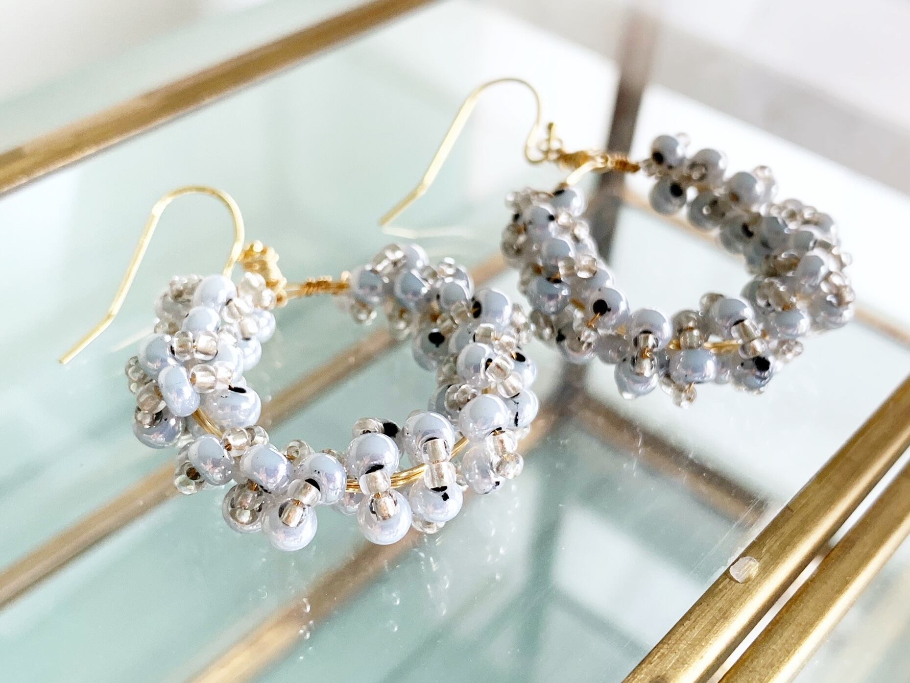 上品なホワイトグレーのチェコビーズ をフープ上に仕立たイヤリング/ピアスです。